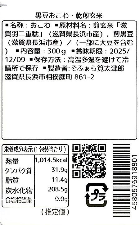 1袋300gに水5500mℓが基本ですが、水分量で、コツコツにも、お粥にもできます、袋の中の白いポップコーン状は、玄米をオーブンした後、フライパンではじかせたものです、食感を少し変えるために入れています、また、玄米は自然栽培の滋賀羽二重餅という品種のもち米です、